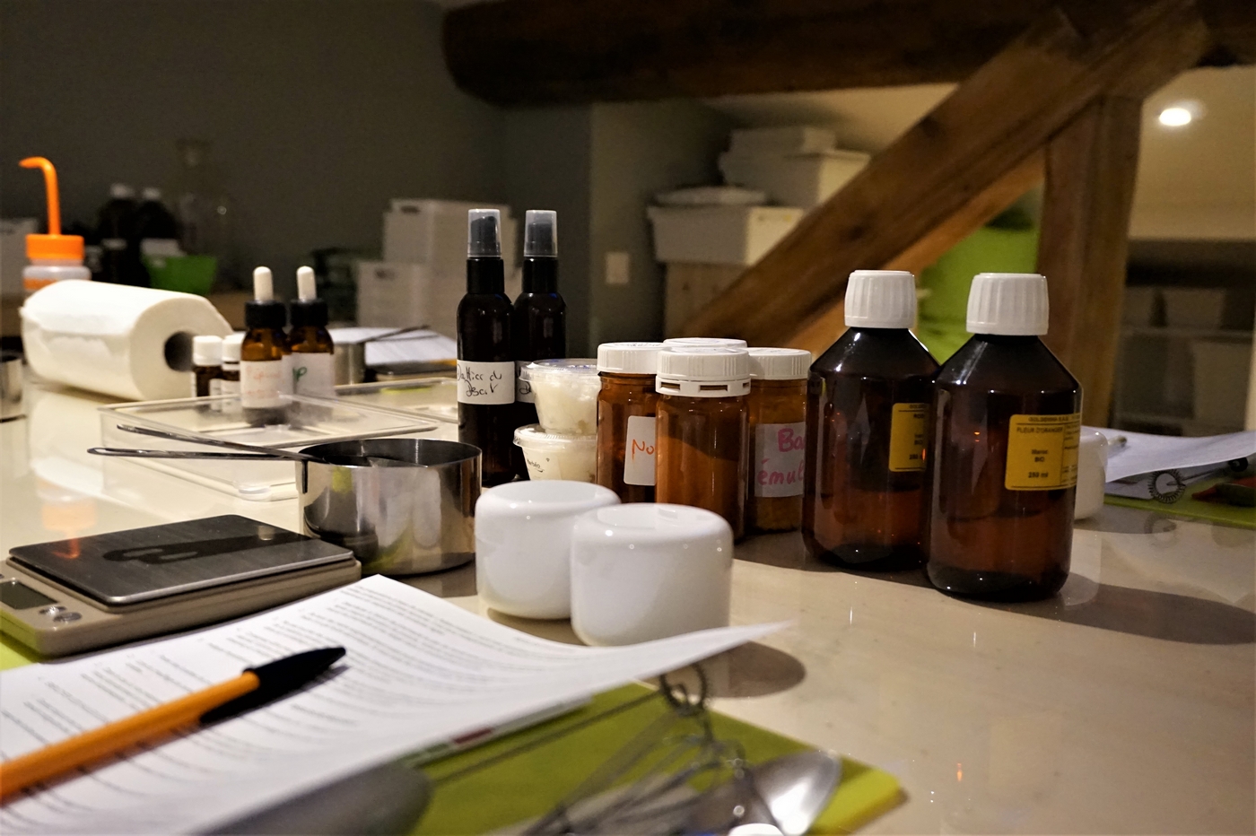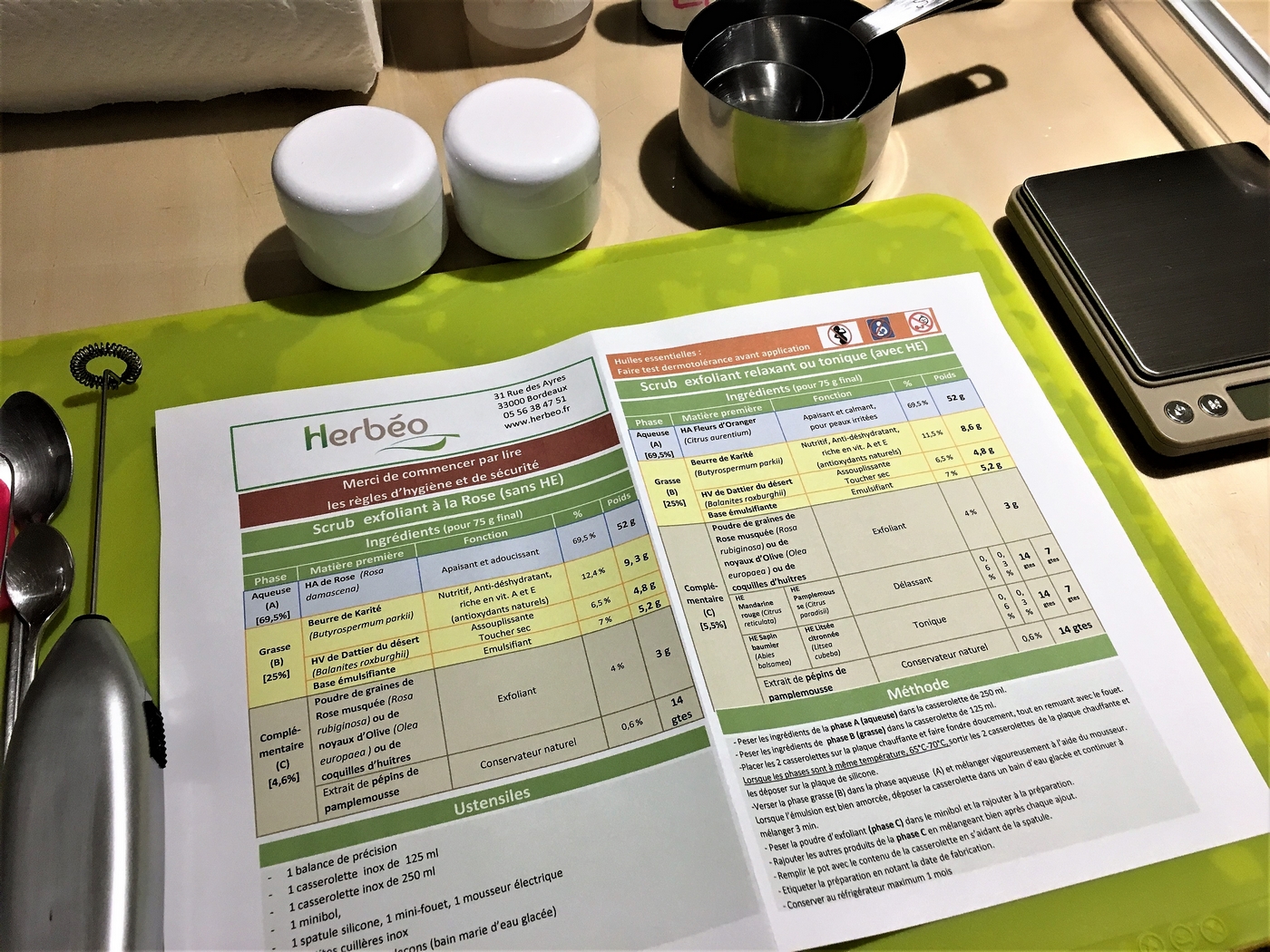 En plus, de référencer pas moins de 500 plantes, de proposer une gamme de 200 huiles essentielles ainsi que des conseils personnalisés et avisés, Herbéo organise également des ateliers fabrication de cosmétiques naturels, menés par Edith en personne. Nous avons donc pu découvrir un de ces ateliers durant 1H30 où nous avons tenté de réaliser un exfoliant pour le corps. Autant vous dire que cela a été assez épique pour Heiva & moi, les dissipées du groupe haha. Plus sérieusement, j’ai adoré cet atelier. J’ai beaucoup appris, mais j’ai aussi pu confirmer certaines de mes connaissances. De A à Z, nous avons donc suivi toutes les étapes de la réalisation d’un gommage pour le corps naturel. À la fin de l’atelier, nous sommes toutes reparties avec nos 3 petits pots remplis, nous n’étions pas peu fières quoi !