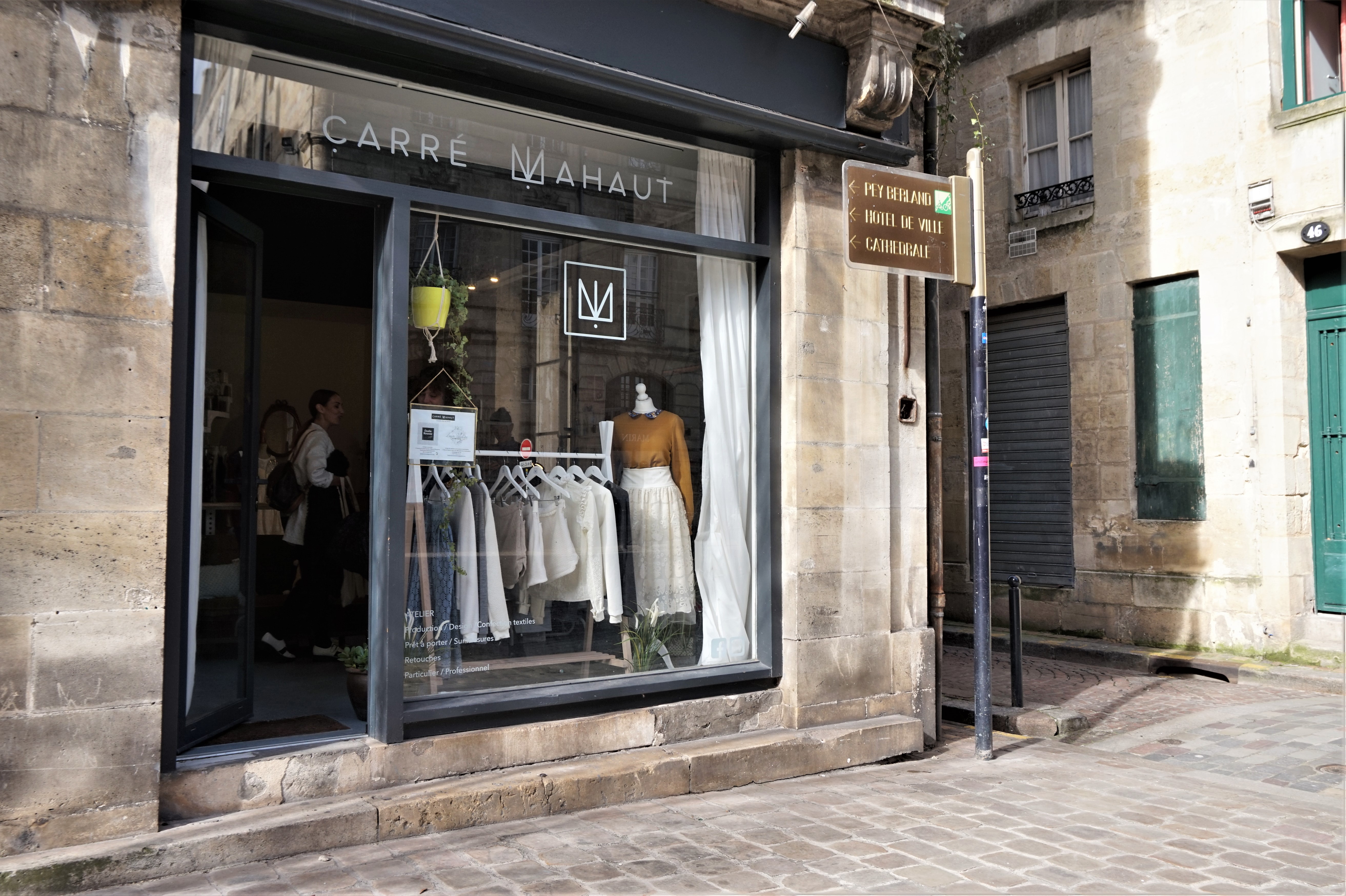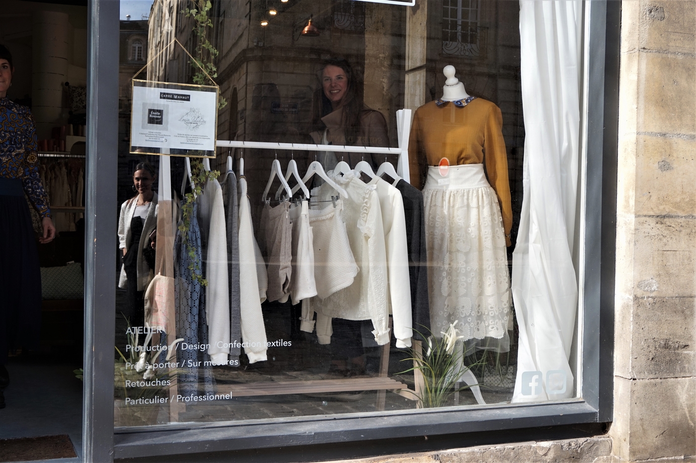 Halte suivante dans notre périple bordelais chez Carré Mahaut. Fondée en 2008, c’est avant tout une marque de prêt-à-porter féminin. Tous les vêtements sont réalisés à la main de A à Z : de la conception à la vente. Chaque année, deux collections permanentes sont proposées : Automne/Hiver & Printemps/été. En terme de prix, cela varie entre 85€ et 125€ environ selon la pièce. Ce qui n’est absolument pas excessif pour du fait-main et du sur-mesure ! Il n’y a qu’à comparer avec les enseignes que l’on connaît toutes.