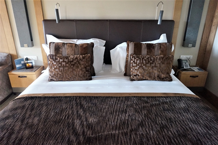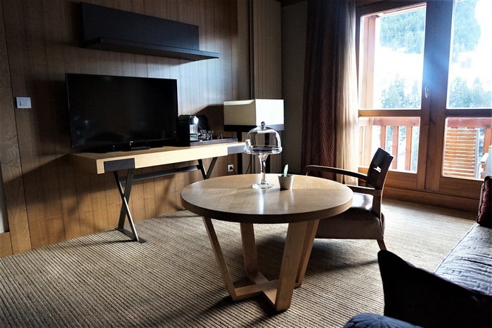 La chambre ne faisait pas moins de 42m² (la taille de mon appartement haha), il s’agissait de la chambre Junior Suite Deluxe avec vue sur les pistes. Le bonheur total ! Dans la suite, on retrouvait tout le confort absolu : lit king size, télévision, machine à café, coin salon avec canapé, balcon, grande douche, baignoire hydro massage, peignoir, chaussons, gamme complète de produits Acqua di Parma (shampooing, après-shampooing, lait pour le corps, gel douche..). J’ai vraiment été charmé par la décoration !