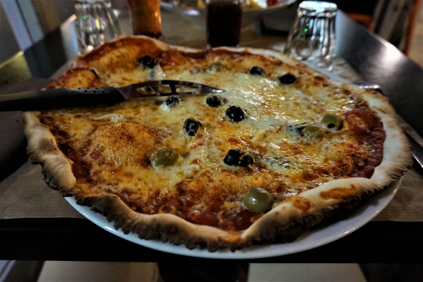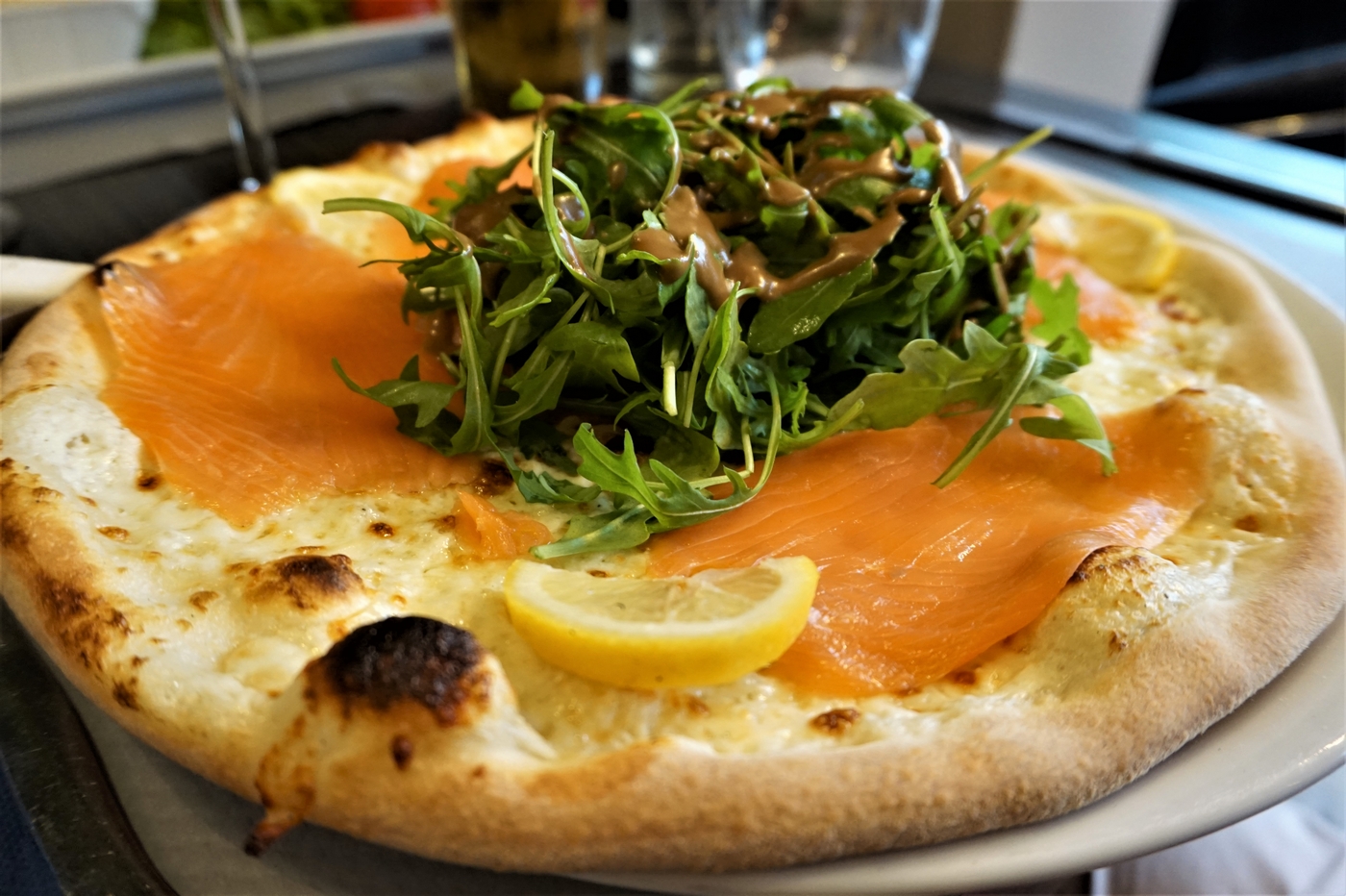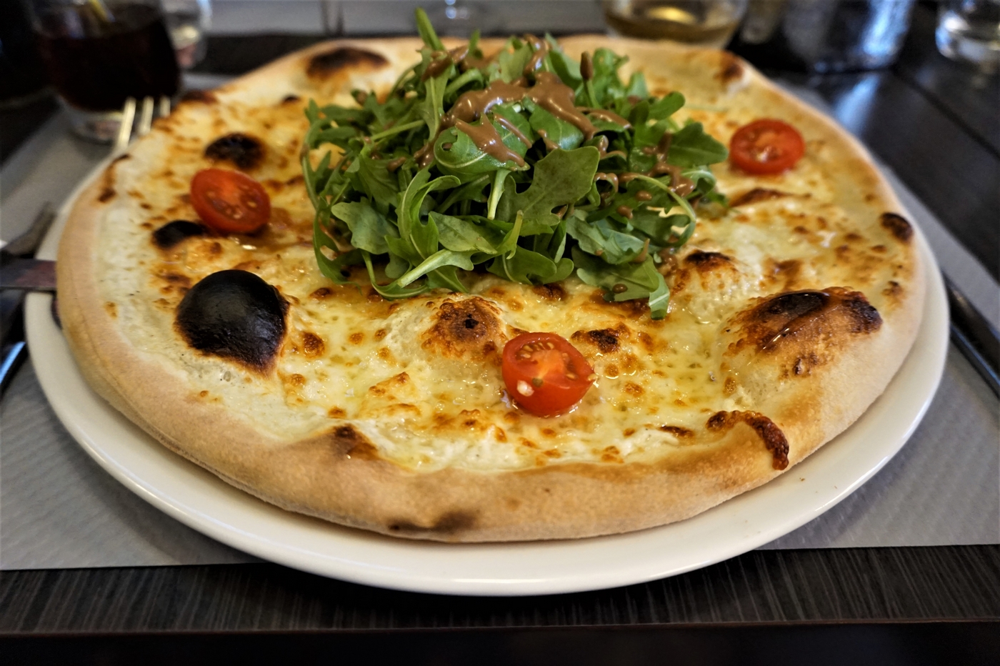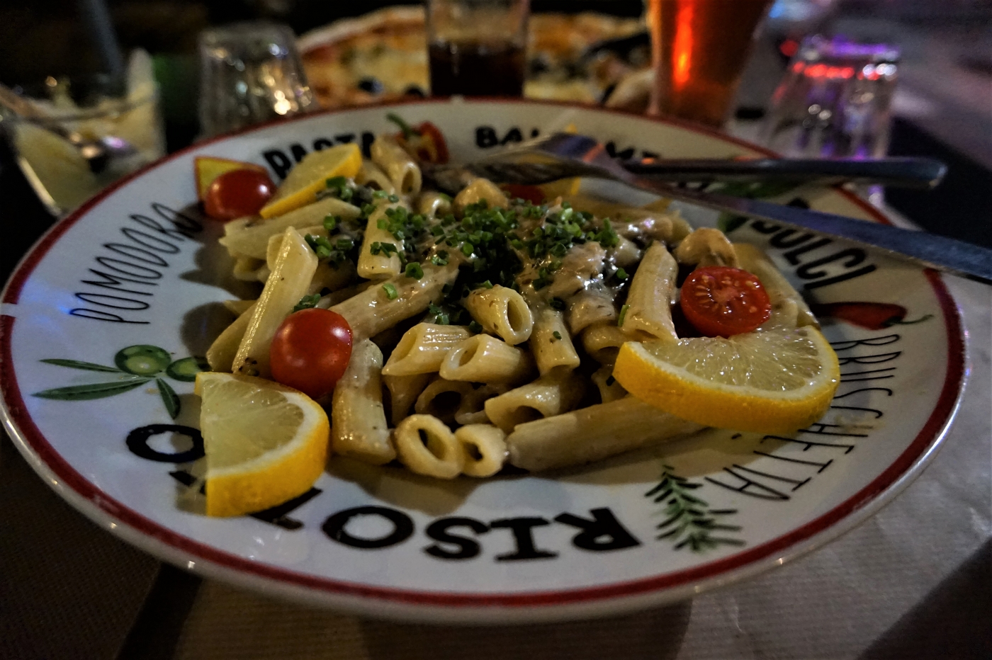 La décoration est dans un esprit plutôt contemporain, très joli. Le restaurant se compose de deux salles ainsi que deux terrasses extérieures couvertes. À la carte, un large choix de pizzas, des pâtes, des salades, des bruschettas, des ravioles ou même de la viande. Jordan a choisi une pizza Napolitaine et moi des penne aux noix de Saint-Jacques, champignons et flambées au cognac. Un régal !