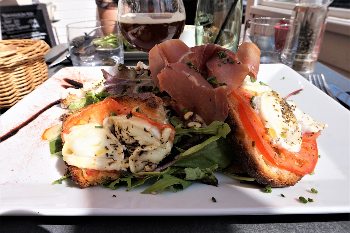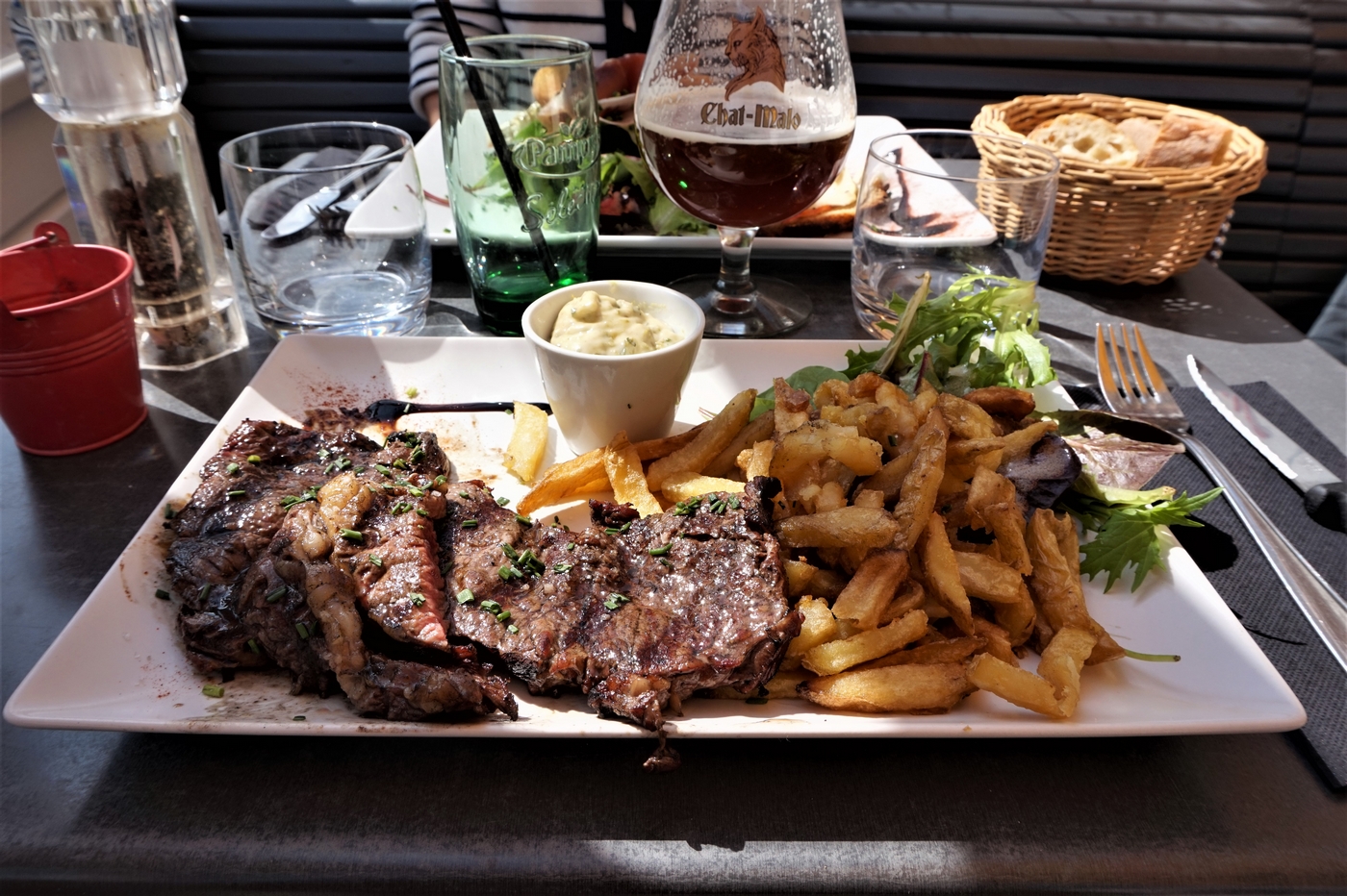 La carte des poissons m’a littéralement donné envie mais ce jour-là, il faisait relativement chaud (oui, oui c’est possible en Bretagne, je vous assure ahah) alors mon choix s’est porté sur une grande salade de chèvres chauds, miel & jambon cru. En effet, elle y est proposé en entrée mais également dans les plats en grand format ! Elle était excellente et les ingrédients bien proportionnés pour seulement 13,00€ ! Jordan, de son côté, a jeté son dévolu sur une entrecôte accompagnée de frites (18,00€). Un classique mais dont il raffole. Mention spéciale pour les frites maison qu’il a adoré.