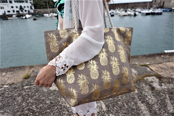 Pour continuer, le deuxième look n’est qu’autre que celui pour la plage ! Big crush pour ce maillot de bain tropical ! Il est un peu grand au niveau du haut, il me manque un peu de maintien mais j’en suis fan. Retrouvez toute la collection bikinis sur le site de Boohoo. Par dessus, j’ai décidé d’opter pour un kimono blanc avec de la dentelle aux extrémités. Cela change de la robe de plage et puis, je trouve qu’il met encore plus en valeur le maillot de bain. Et enfin, le sac de plage avec des ananas dorés pour y glisser la serviette et la crème solaire !